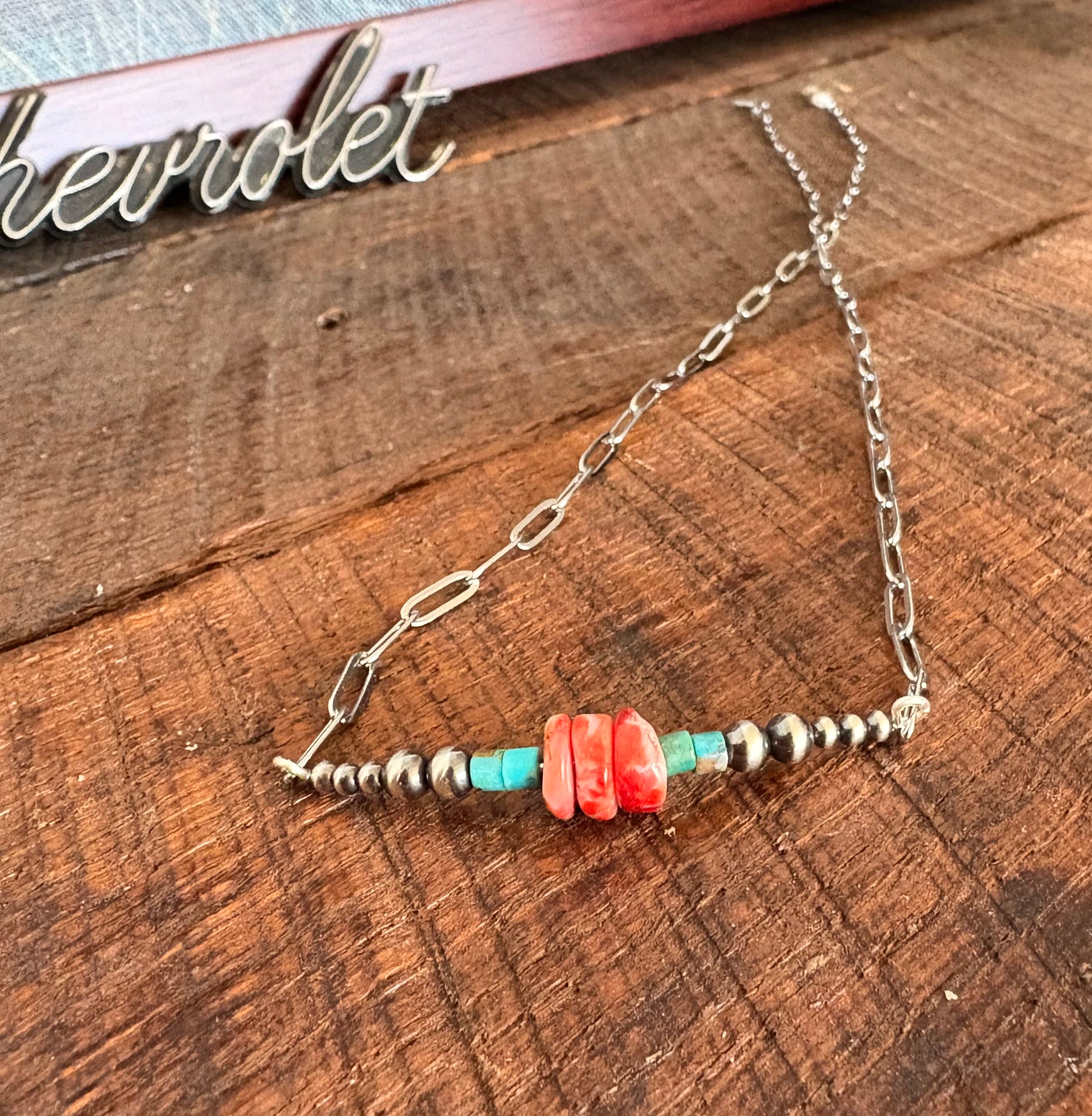 paperclip chain with Navajo, turquoise and spiny oyster on accent bar