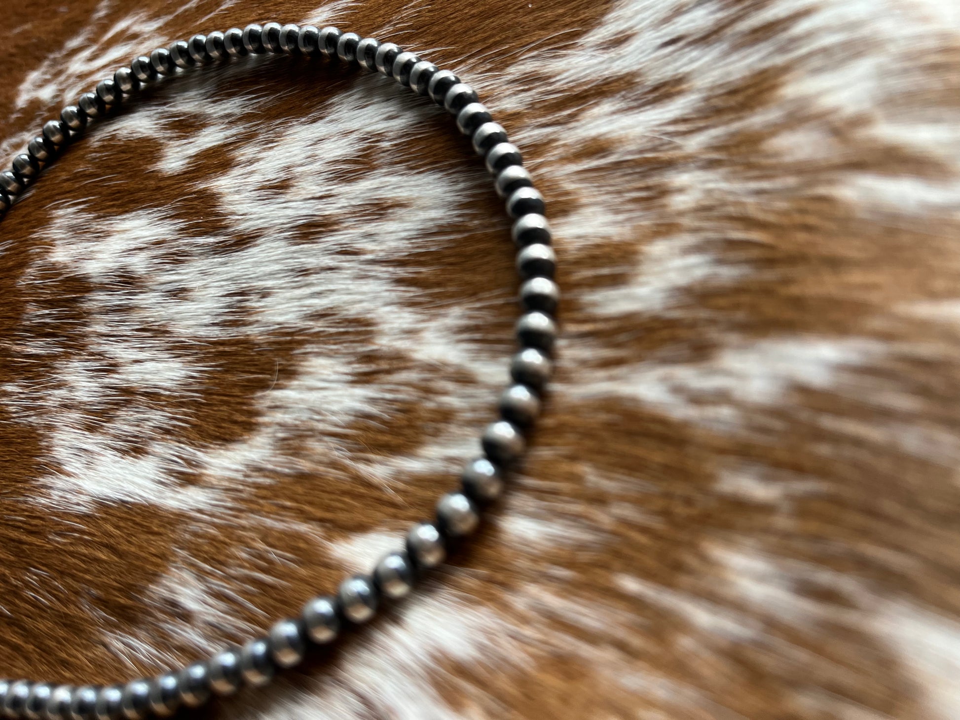 Pictured is our model wearing the authentic Navajo pearl choker necklace accompanied with our lariat.
