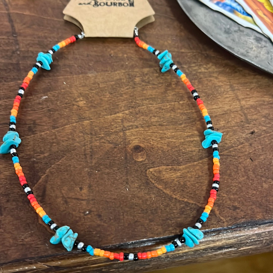 Western inspired beaded choker featuring turquoise chip. Has an extender chain for the perfect fit. layer with our favorite ace paperclip chain!